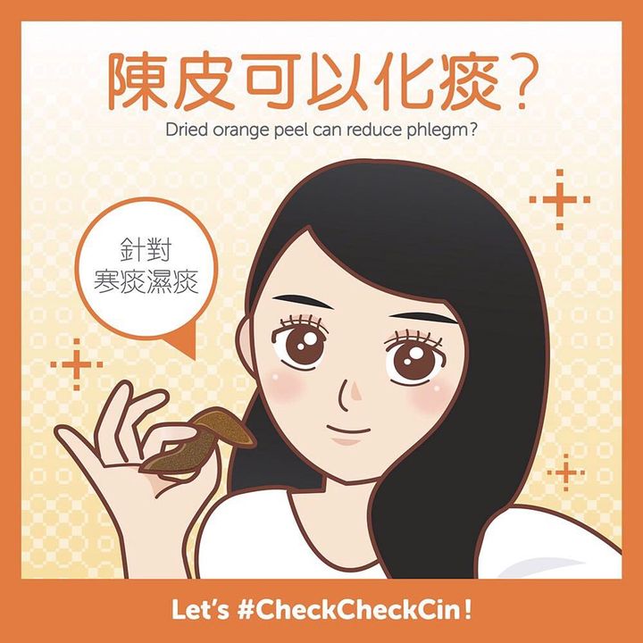 最近天氣持續乍暖還寒,喉嚨好容易不適,經常都似有痰滯於氣管中。人人都說陳皮可以化痰,究竟是否食幾塊陳皮就有幫助?中醫角度而言,痰分為不同種類,有寒性、熱性、濕和燥,而陳皮性質溫燥,只針對因寒和濕引起的痰,可以以陳皮煎水或直接食用,但因為其他性質的痰就不適合食用了,所以最好都是CheckCheckCin! ▶︎The weather has been warming up but still cold at times which makes people vulnerable to sore thoats and phlegm in the respiratory tract. People say died orange peel can reduce phlegm, how many pieces would you have to eat to achieve the effect? From Chinese medicine perspective, there are four types of phlegm- cold, hot, damp, and dry. Dried orange peel is mild and dry in nature, so it can help with phlegm caused by cold and dampness. You can eat it directly or decoct in water to consume. It is not suitable for other types of phlegm so it’s important to CheckCheckCin with any condition and potential remedies.