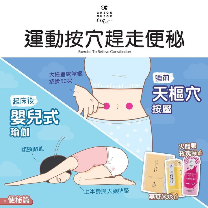 食無定時、飲食不節、壓力大、久坐不動、運動不足等原因,令都市人便秘情況非常普遍,便秘不單是腸胃問題,更會引伸出腹脹、皮膚變差、睡眠質素下降等問題。想決心解決便秘問題,除了從改善飲食著手,也可以做有助刺激腸道的運動及按壓穴位,每天起床後抽數分鐘時間做一個入門瑜伽動作——嬰兒式,有助刺激腹部肌肉和腸道,促進消化吸收。晚上睡前按壓腹中部的天樞穴,有助促進大腸經的氣血運行,紓緩便秘症狀。