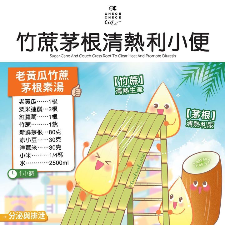 相比起冬天,夏天要上廁所小便的次數相對減少,這是因為天氣熱令出汗量增加,部份身體水份已隨汗液排出,所以小便次數減少屬正常現象。但如果你發現小便次數不但減少,而且尿液顏色變黃、混濁、排尿感覺不暢順,甚至有灼熱或刺痛感,身體就有可能受濕熱影響,宜適量飲用有清熱利尿功效的湯水,紓緩小便短赤的症狀。竹蔗、茅根是常見的清熱配搭食材,兩者均性寒,竹蔗清熱生津,茅根清熱利尿,不少街市菜檔更會配搭馬蹄、粟米等材料方便包出售,惟注意脾胃虛寒、便溏腹瀉者不宜飲用此湯。