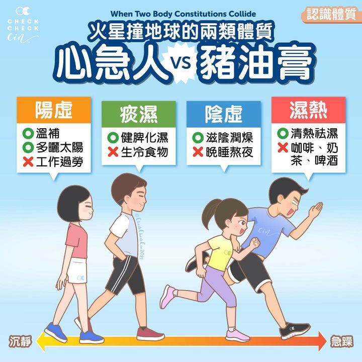 體質除了反映身體狀況,也能略略反映性格。當陰虛和濕熱體質的人體內熱偏盛,遇上陽虛和痰濕體質的人,隨時像火星撞地球一樣,因為一般陽氣偏盛的人性格較為急躁;而陽氣不足的人卻缺乏朝氣,性格多會是沉默、安靜、內向。